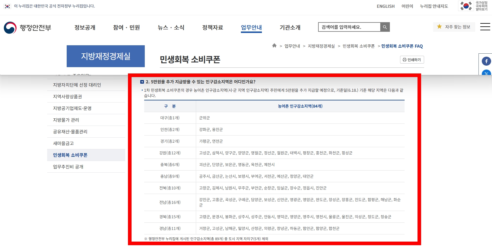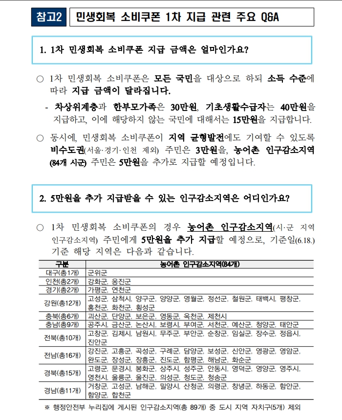 - 5만원 추가 지급 대상: 농어촌 인구감소지역 (전국 84개 시/군)