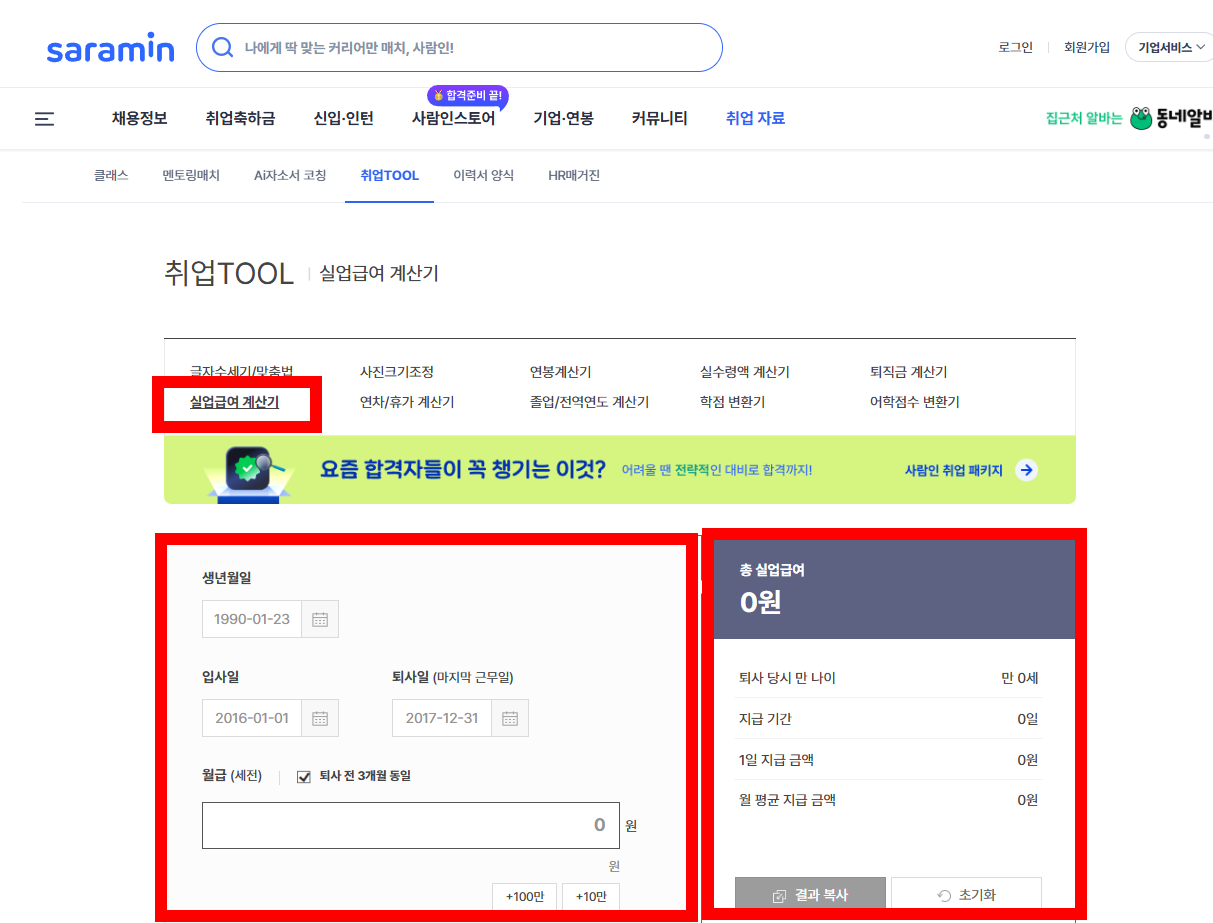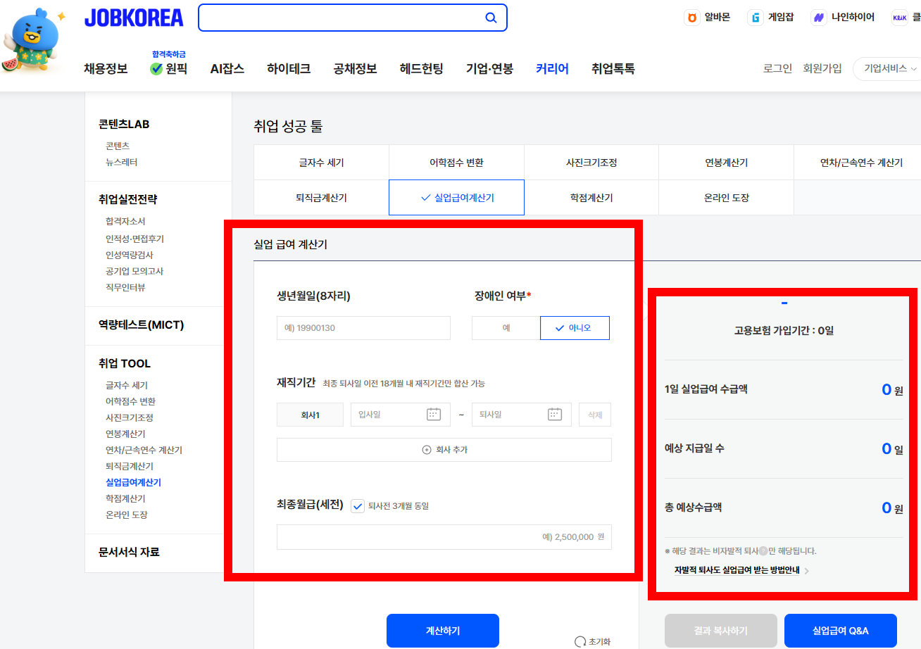 잡코리아나 사람인에서도 실업급여 계산기를 제공 중입니다. 입사일·퇴사일·월급을 입력하면 1일 지급액과 총 수급일수, 수급액을 모의로 확인할 수 있어요. 직관적인 디자인 덕분에 쉬운 사용이 장점이지만, 항상 공식 계산 결과와 오차가 있을 수 있으니 참고용으로만 사용하세요.