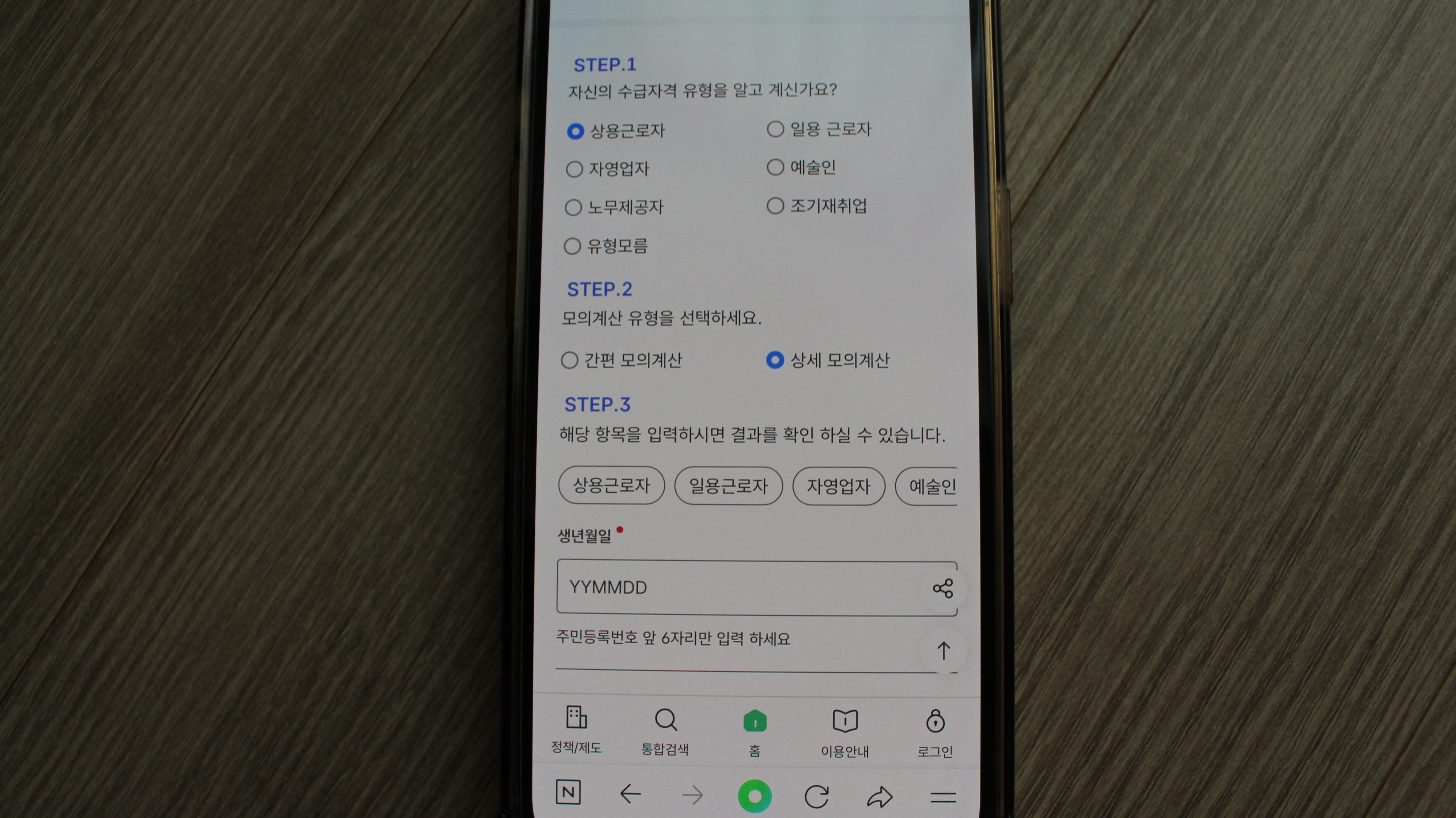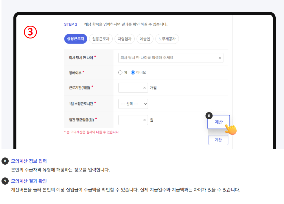 - 나이, 고용보험 가입기간, 평균임금 입력