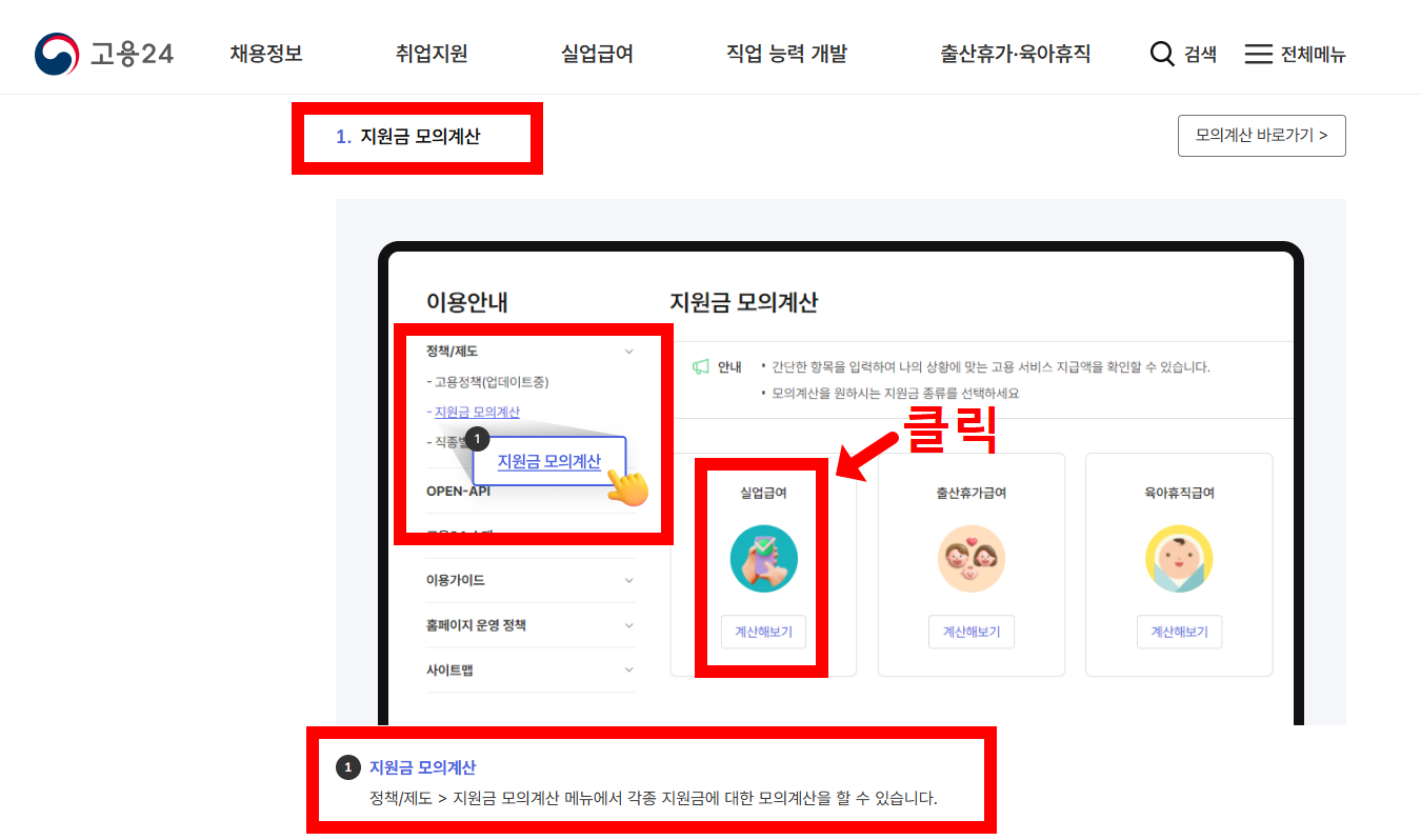 - 메뉴에서 ‘이용안내 → 정책/제도 → 지원금 모의계산’ 클릭 (아래 링크 클릭하시면 편하게 바로갈수 있습니다.)