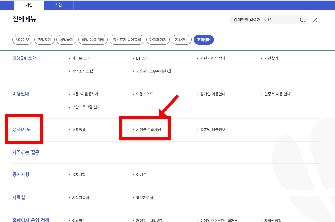 - 메뉴에서 '이용안내 → 정책/제도 → 지원금 모의계산' 클릭