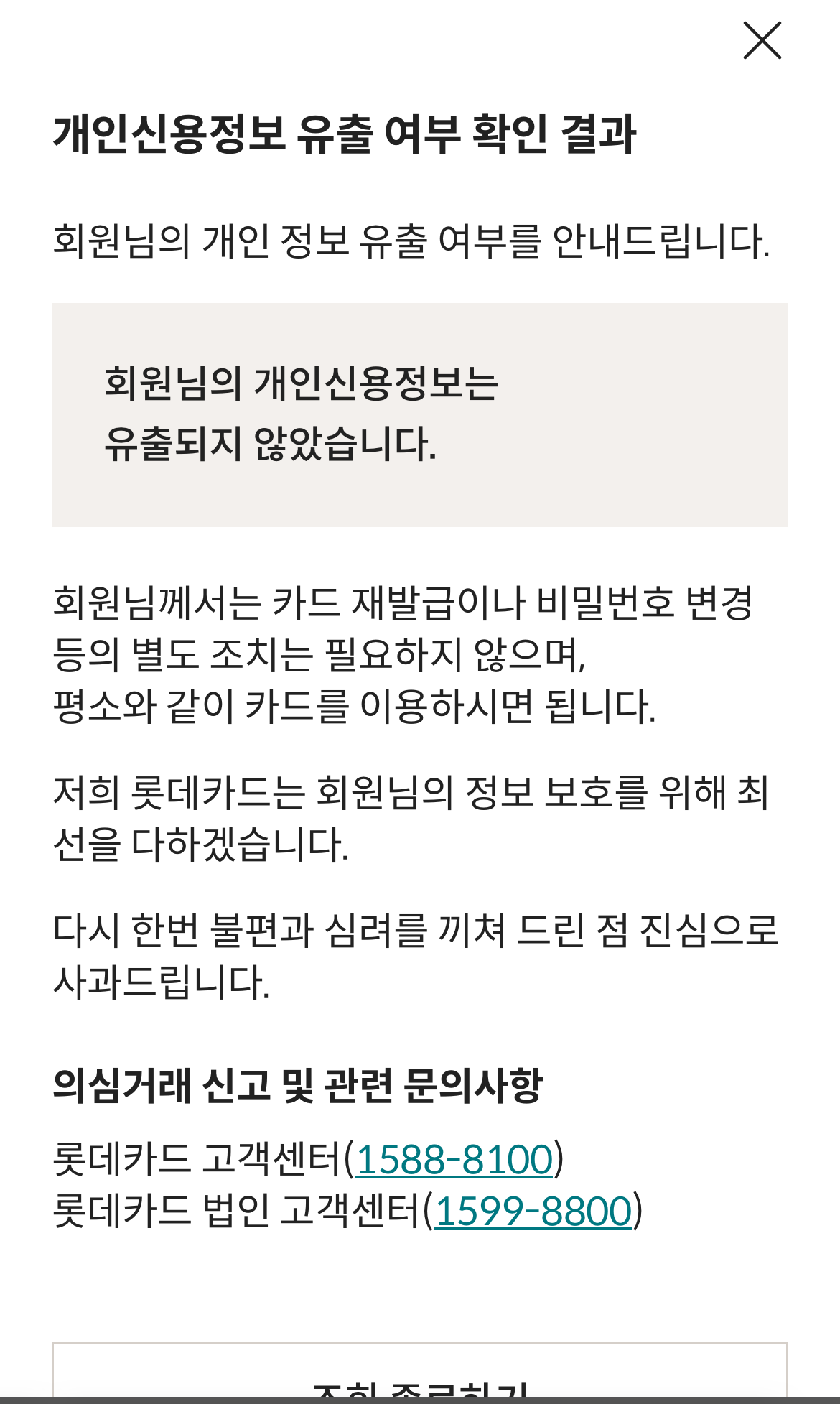 - 롯데카드 앱 실행 → 개인신용정보 유출 사실 및 조치 방법 안내 → 개인정보 유출 여부 확인
